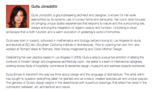 Icelandic-born Gulla Jónsdóttir creates unexpected and poetic modern architecture and interior spaces. Known for her sensual and dynamic forms that work in harmony with their surroundings, Gulla’s environmental compassion brings unique spatial experiences that respond to nature and surrounding site, always echoing the integration of organic beauty and function. Her limited-edition furniture pieces are a natural extension of her architectural and interior practices, celebrating form and materials to meet a specific functional need. Gulla studied mathematics before moving to Los Angeles to study architecture at SCI-Arc (Southern California Institute of Architecture). Before starting her own firm in 2009, she worked for Richard Meier, Walt Disney Imagineering, and Dodd Mitchell Design.